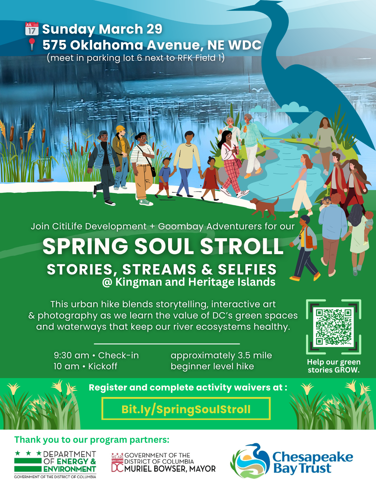 Join CitiLife Development and Goombay Adventures for an urban hike that blends storytelling, interactive art, and photography. You’ll learn about the value of DC’s green spaces and waterways that keep our river ecosystems healthy.